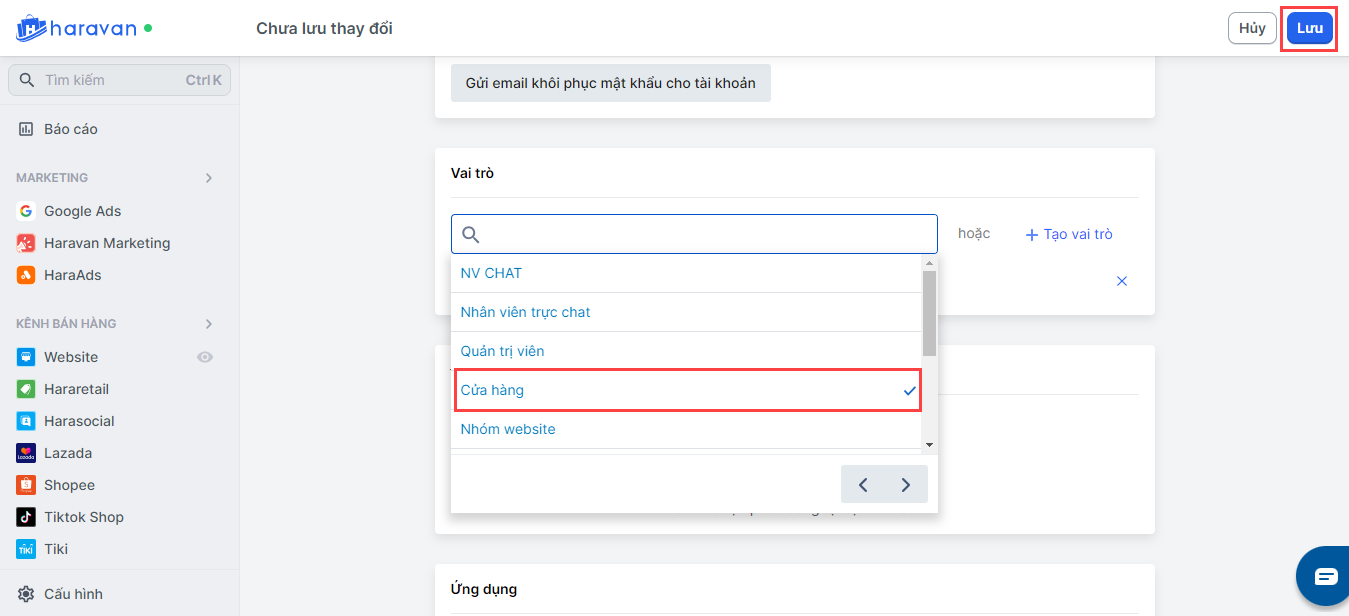 Bước 5: Để nhân viên có thể thao tác bán hàng, kiểm kho,...nhà bán cần gắn nhóm vai trò chứa các quyền tương ứngcho tài khoản nhân viên. Ở phần Vai tròtrong trang tài khoản nhân viên, bạn tìm kiếm và chọn**nhóm vai trò**để phân quyền cho tài khoản nhân viên này -> Bấm **Lưu.**