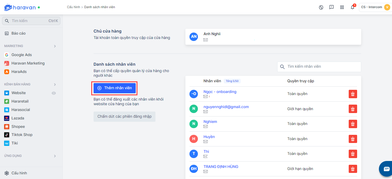 Tính năng Thêm mới tài khoản cho phép bạn tạo tài khoản đăng nhập vào Haravan cho từng nhân viên, sau đó phân quyền cho nhân viên đó để bắt đầu bán hàng.