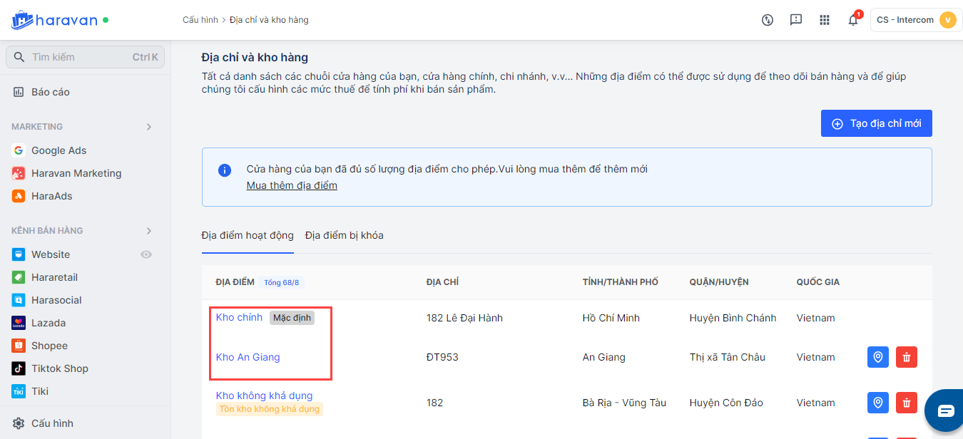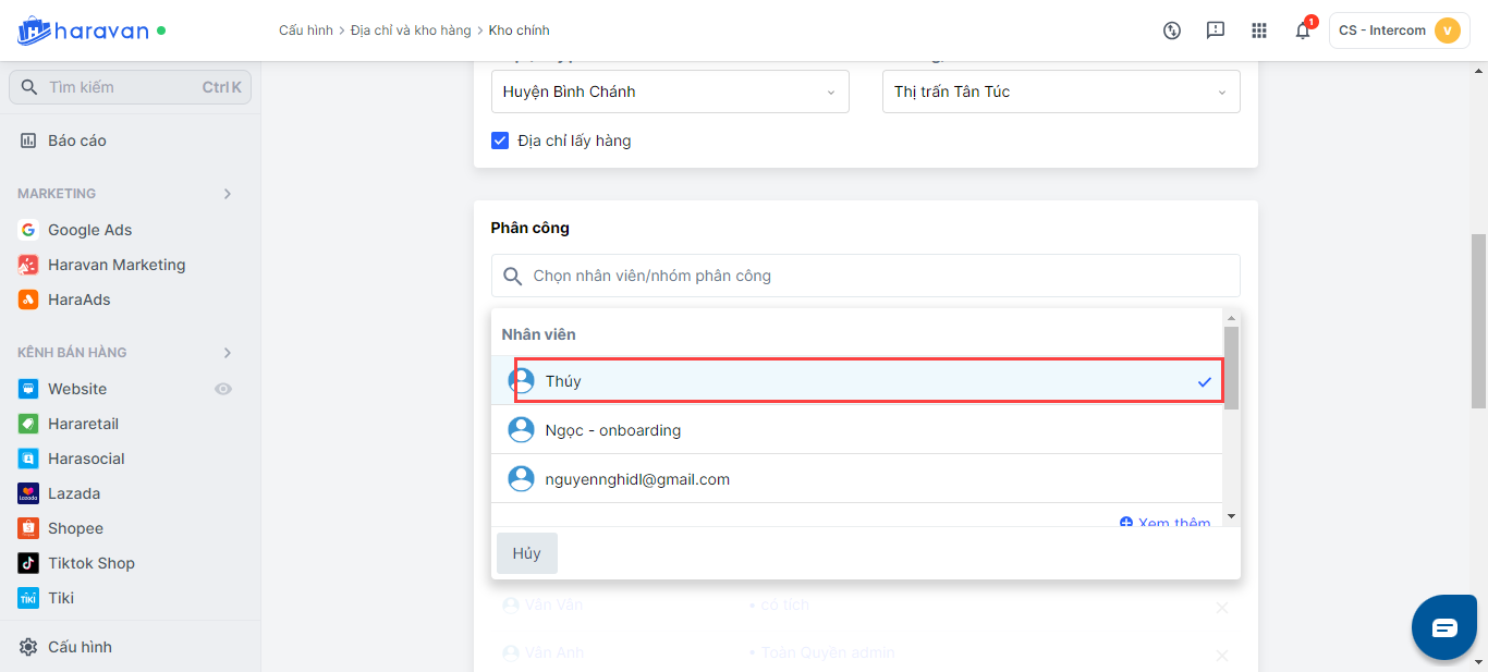 **Bước 7:**Chọn địa chỉ bán hàng bạn cần thêm nhân viên
