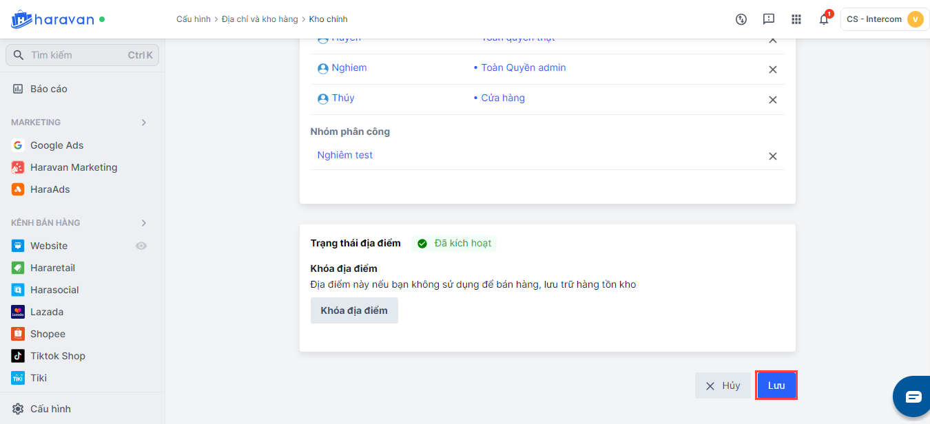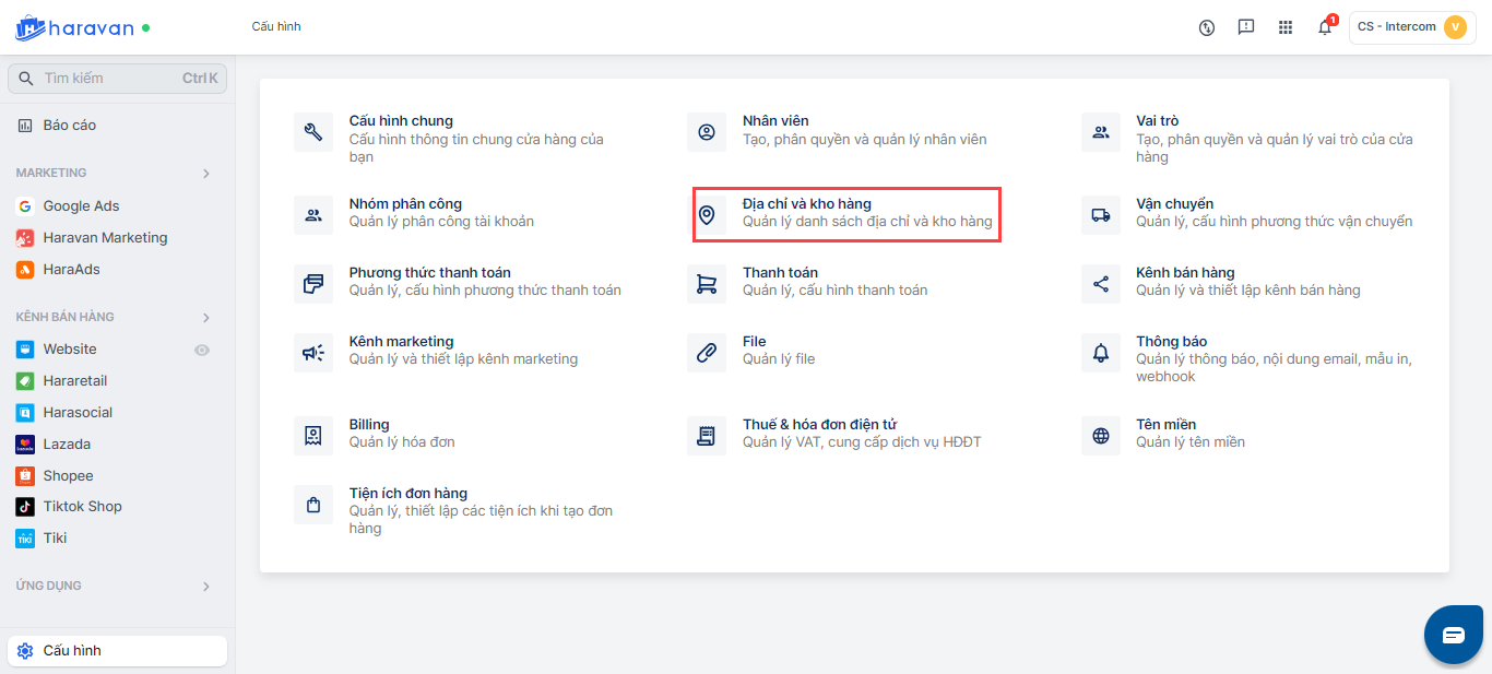 **Bước 6:**Sau khi đã phân quyền thành công, bạn cần thêm nhân viên vào chi nhánh bán hàng.Để thao tác, bạn c**họn Địa chỉ và kho hàng** trong Cấu hình.