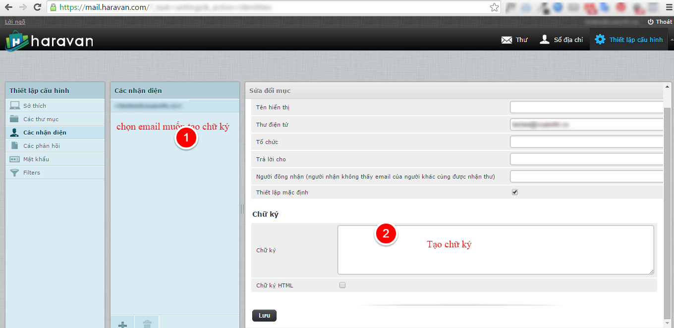 - Chọn vào email muốn tạo chữ ký --> có mục chữ ký --> điền chữ ký muốn tạo vào.