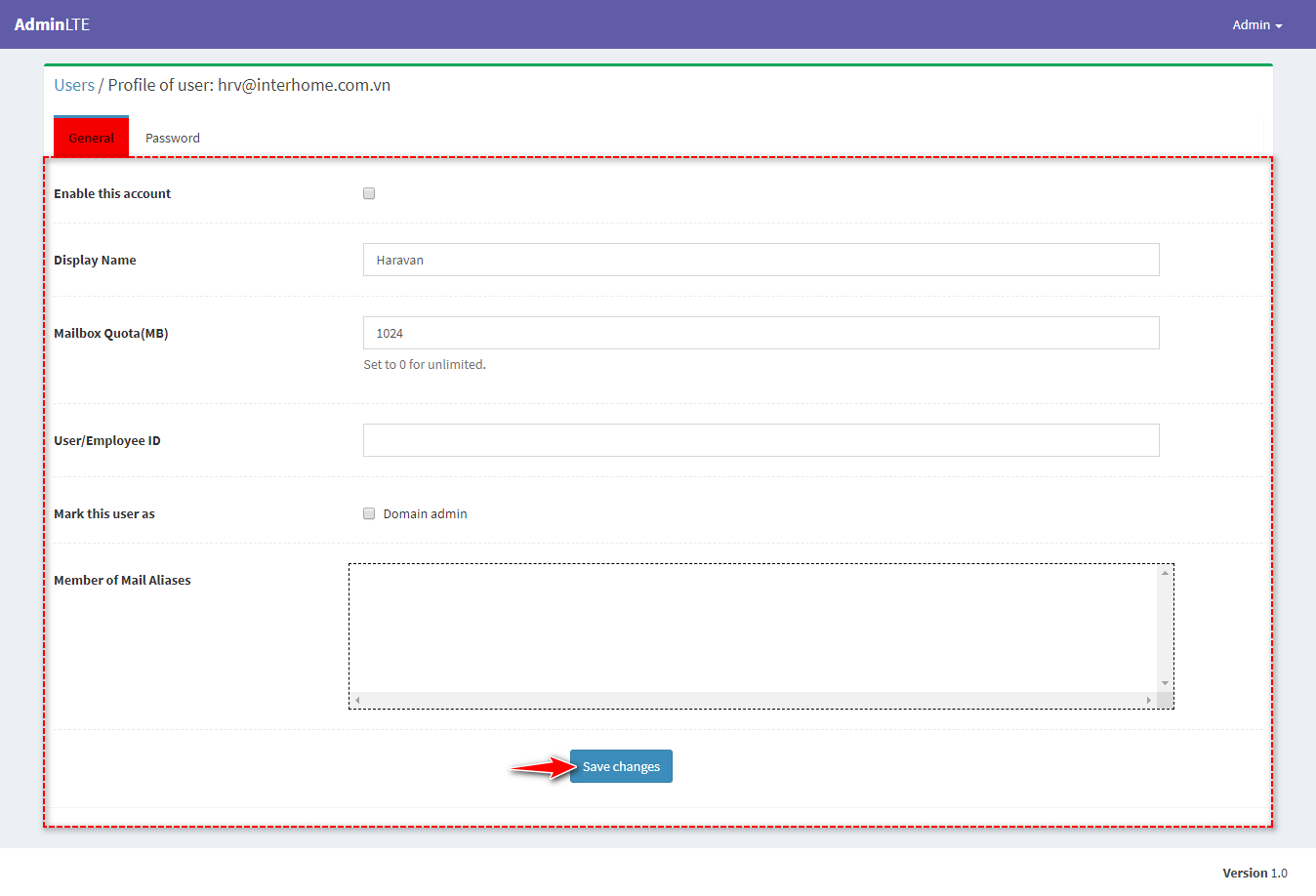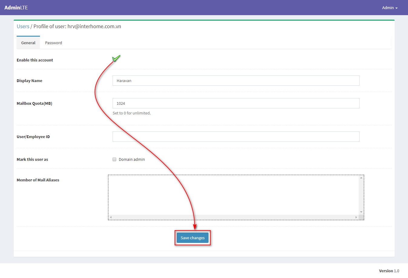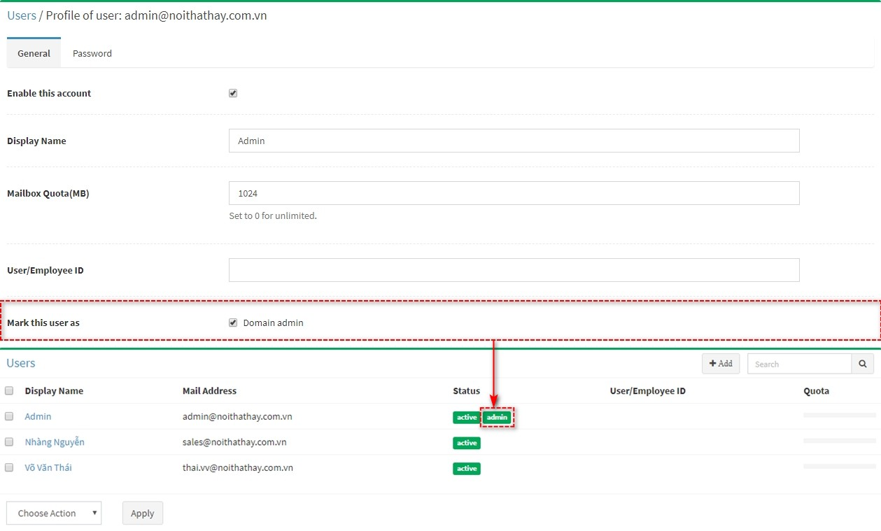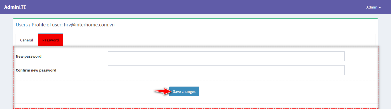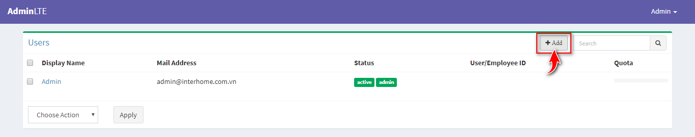 - Trong trang Users của AdminLTE, nhấp vào tài khoản email doanh nghiệp.