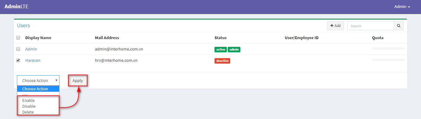 - Trong trang Users của AdminLTE, nhấp vào tài khoản email doanh nghiệp cần thao tác.