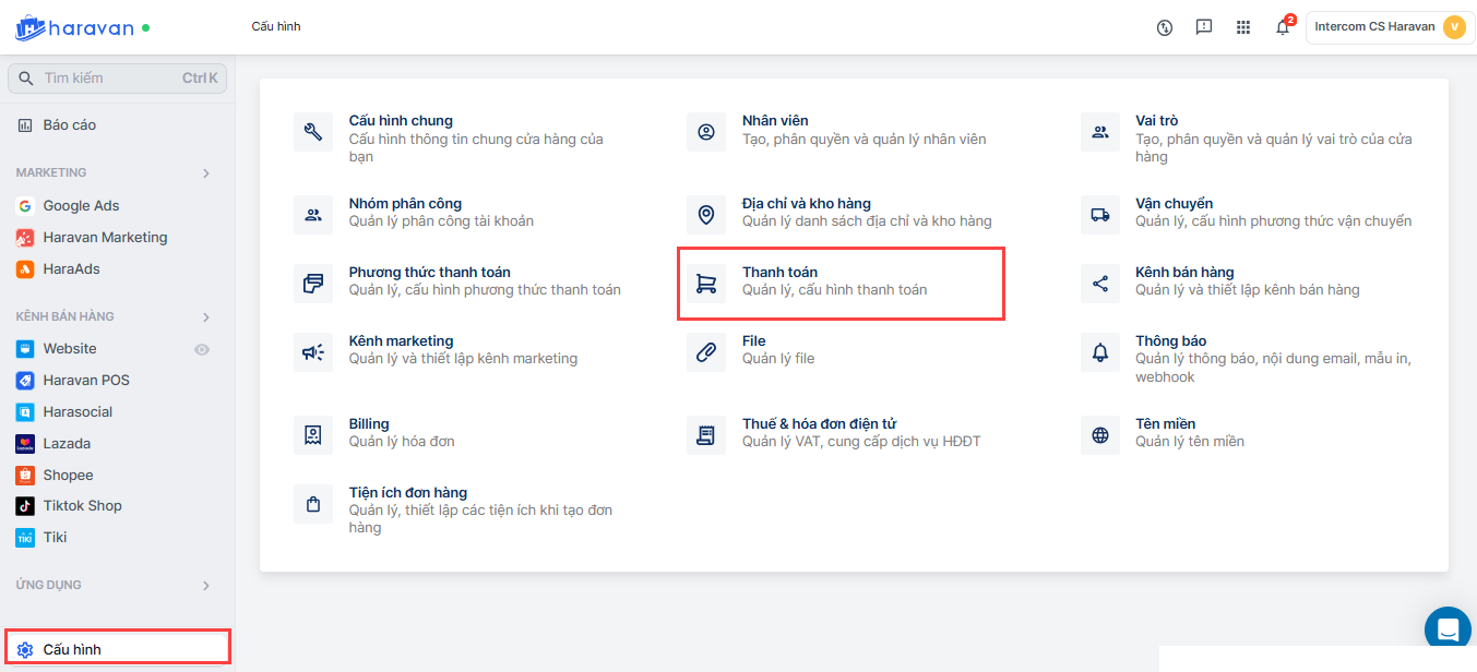 - Truy cập vào admin Haravan, mục Cấu hình -> Chọn Thanh toán