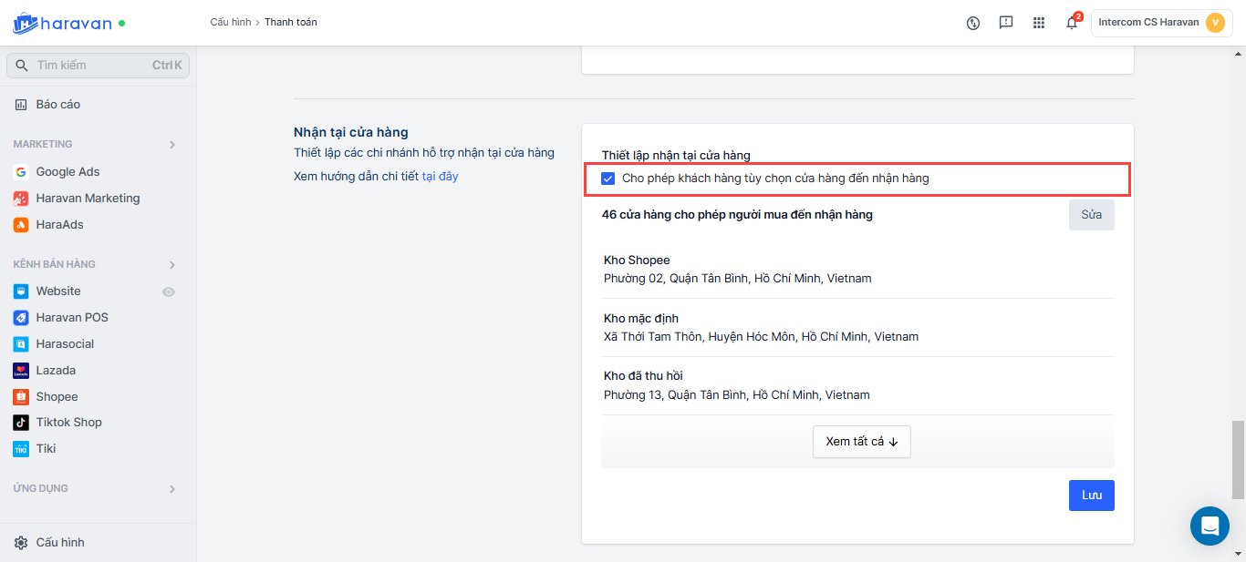 - Thiết lập nhận tại cửa hàng (khách tự đến lấy hàng)