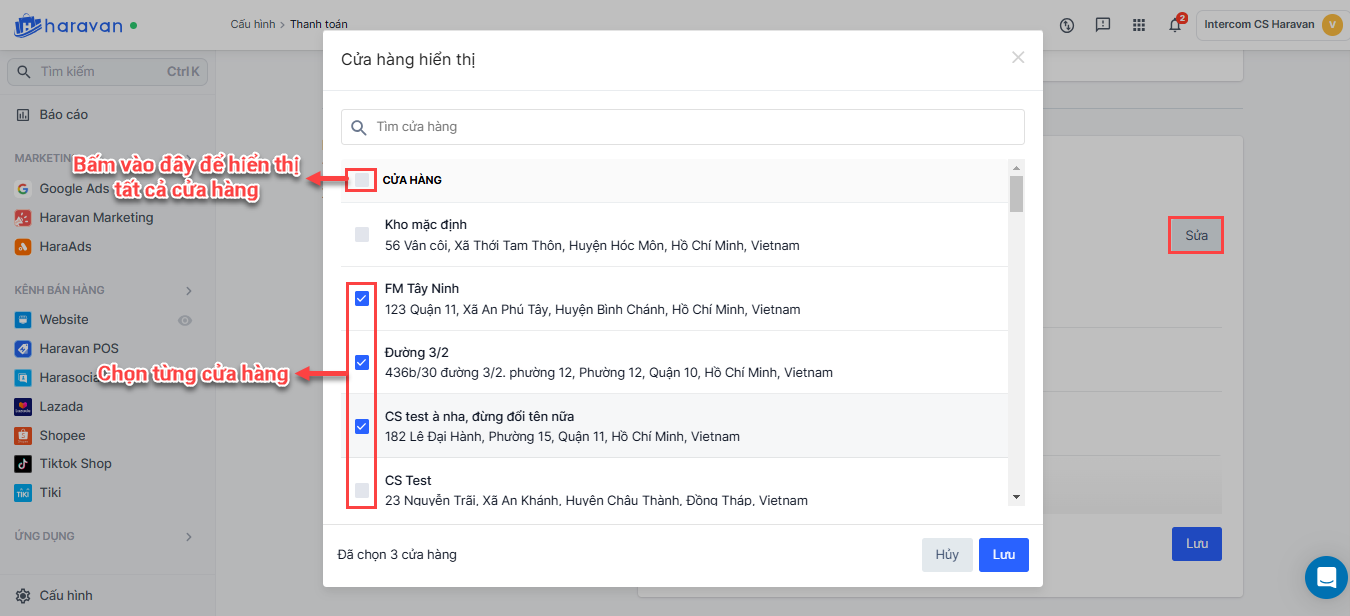 Bấm vào Sửa để chọn các cửa hàng cho phép người mua đến nhận hàng