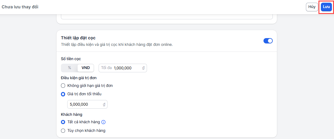 - Điều kiện giá trị đơn: Không giới hạn đơn nghĩa là tùy chọn đặt cọc sẽ luôn hiển thị trên trang thanh toán. Giá trị đơn tối thiểu thì tùy chọn đặt cọc chỉ hiển thị khi đơn hàng đạt giá trị đơn tối thiểu.