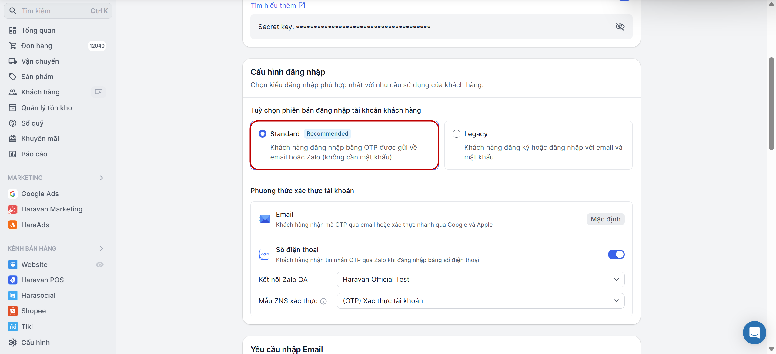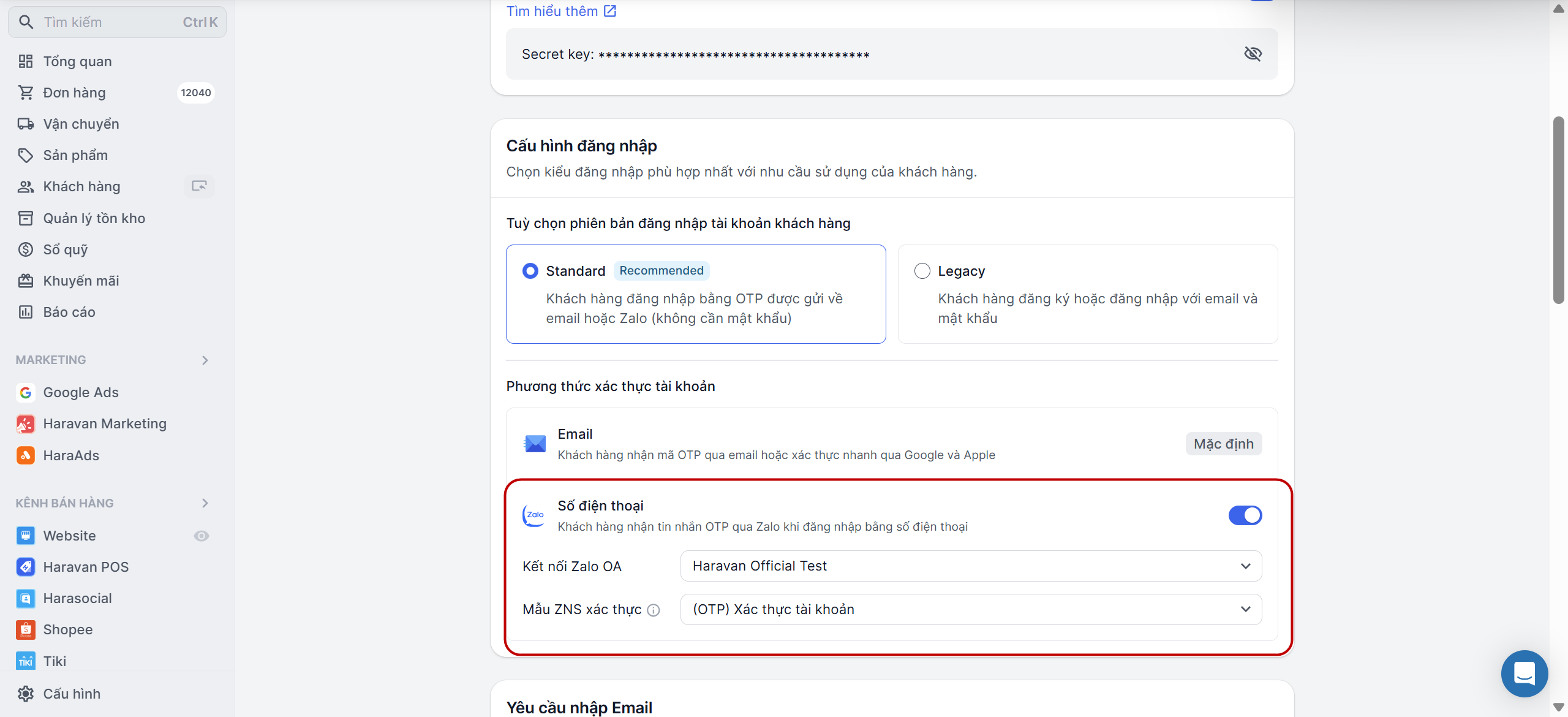Sau khi template được duyệt, nhà bán trở lại mục Cấu hình đăng nhập,kích hoạt phương thức xác thực tài khoản qua số điện thoại, kết nối Zalo OA và chọn mẫu ZNS xác thực.