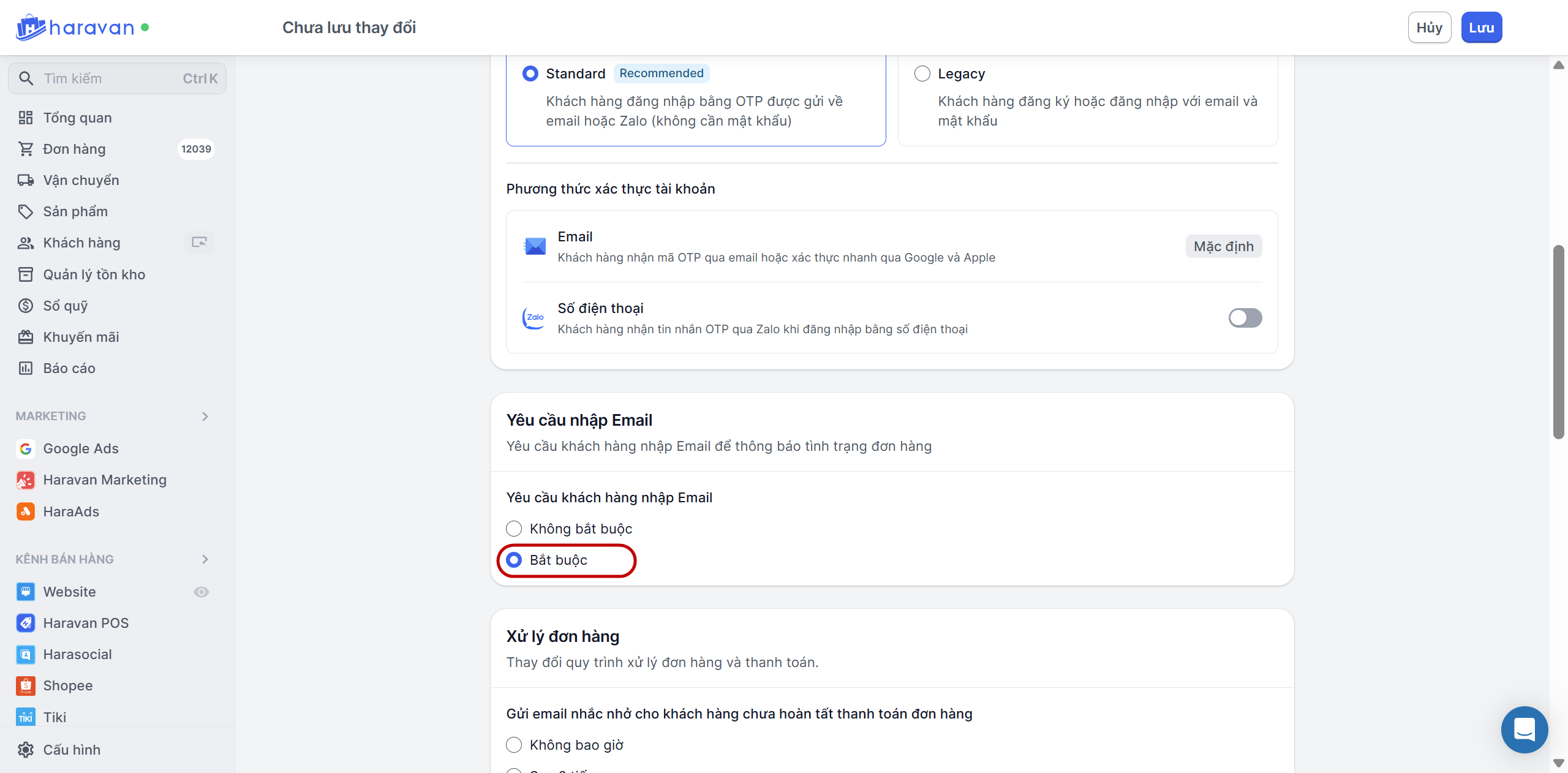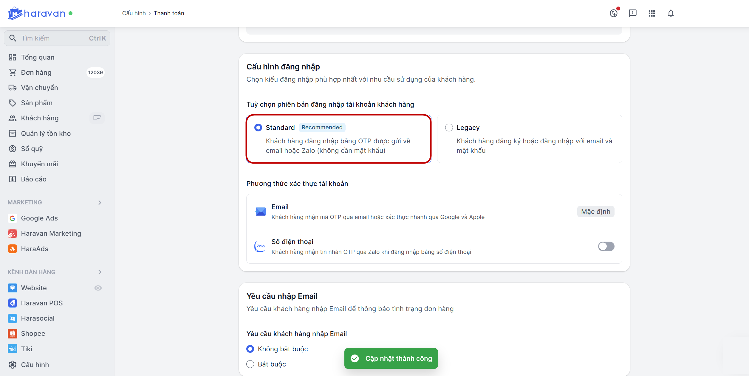 Để bật cấu hình đăng nhập thông minh, nhà bán vào mụcCấu hình và chọn Thanh toán. Tại mục Cấu hình đăng nhập, chọn phiên bản đăng nhập Standard. Phương thức đăng nhập qua Google, Apple và xác thực OTP qua email được cài đặt mặc định.
