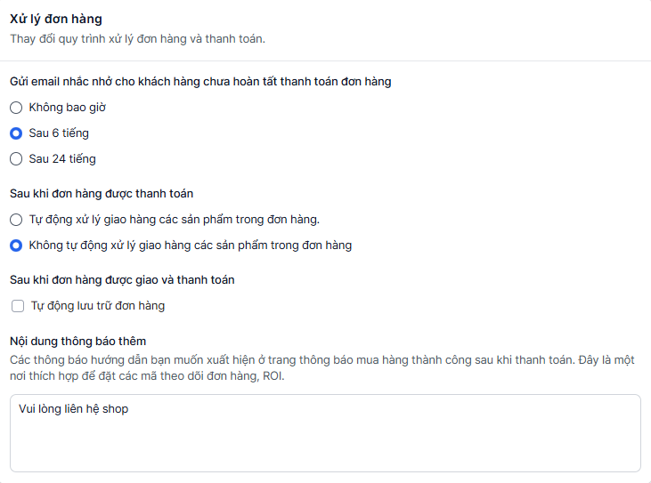 - Cài đặt thông báo thêm trên trang thông báo mua hàng thành công.