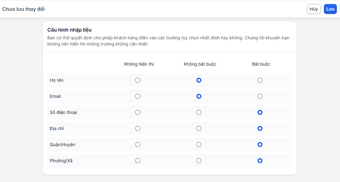 Kéo xuống mục **Cấu hình nhập liệu.**Tại đây Nhà bán hàng có thể chọn: Họ tên, Email, Số điện thoại, Địa chỉ, Quận/huyện, Phường/xã. Các tùy chọn bao gồm:
