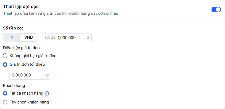 Nhà bán có thể chủ động thiết lập yêu cầu đặt cọc cho các đơn hàng có giá trị lớn, đảm bảo cam kết mua hàng trước khi xử lý giao vận. Hiện tính năng đang áp dụng cho trang thanh toán thông minh, nhà bán có nhu cầu trải nghiệm có thể liên hệ với bộ phận chăm sóc khách hàng để được hỗ trợ.