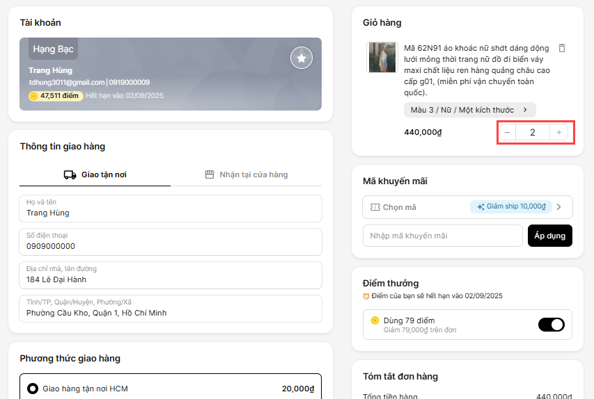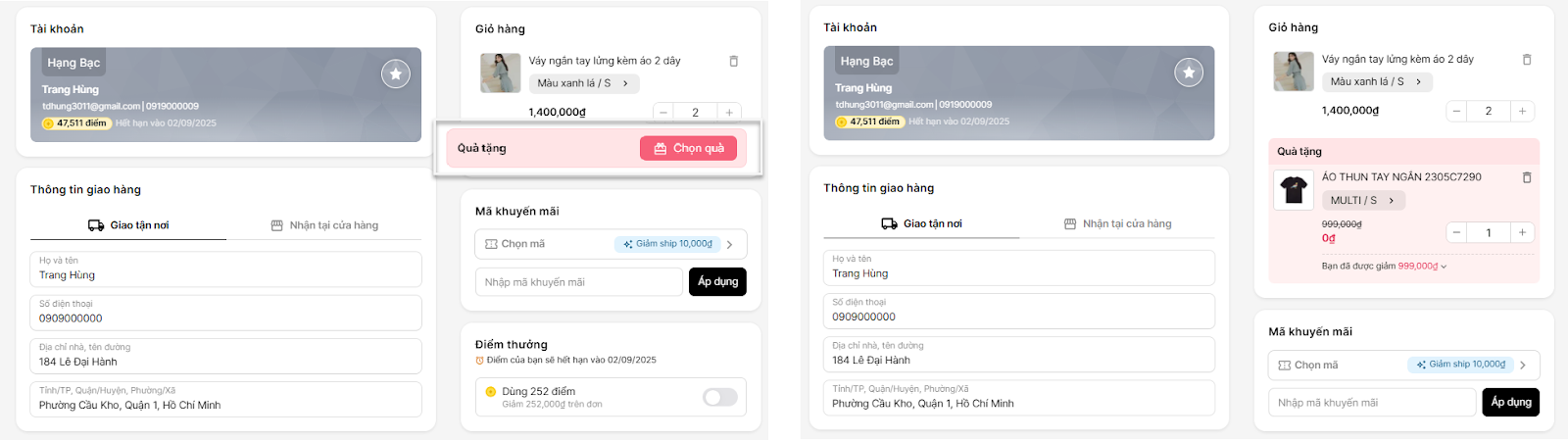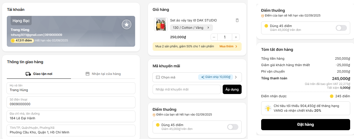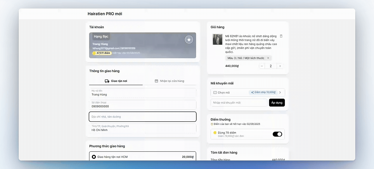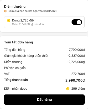 Trang thanh toán giờ đây thành "ví ưu đãi" tiện lợi, nơi khách hàng có thể tận dụng tối đa quyền lợi của mình ngay trong quá trình mua sắm. Hệ thống hiển thị điểm thưởng cùng với mức khuyến mãi tương ứng, cho phép nhà bán chủ động lựa chọn quy đổi điểm thưởng áp dụng trên đơn.