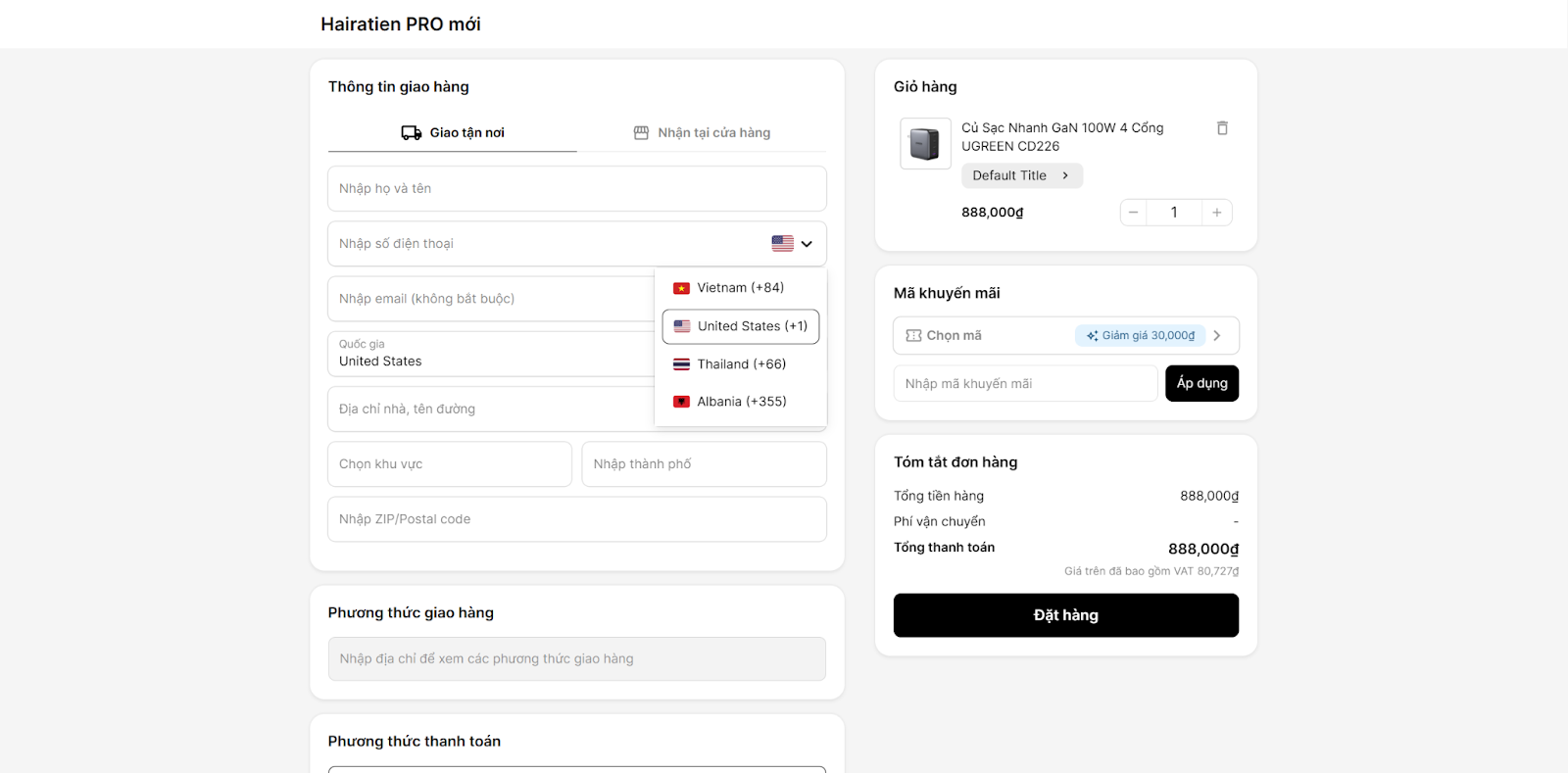 Trang thanh toán cho phép chọn quốc gia và nhập địa chỉ, số điện thoại theo vùng quốc gia, nhằm hỗ trợ nhà bán quốc tế hoặc đang phục vụ tệp khách hàng ngoại quốc.