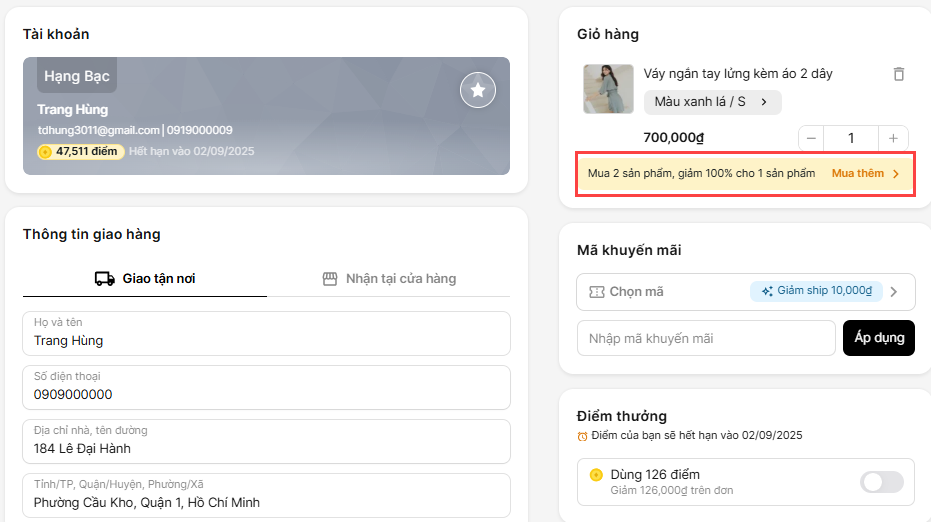 Xem cấp bậc hạng thành viên, điểm thưởng, khuyến mãi KHTT hiển thị trên trang thanh toán mới