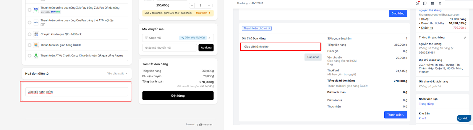 Người mua có thể dễ dàng nhập ghi chú đơn hàng ngay trong quá trình thanh toán. Tính năng này giúp nhà bán hiểu rõ nhu cầu khách hàng để xử lý đơn hàng chính xác hơn.