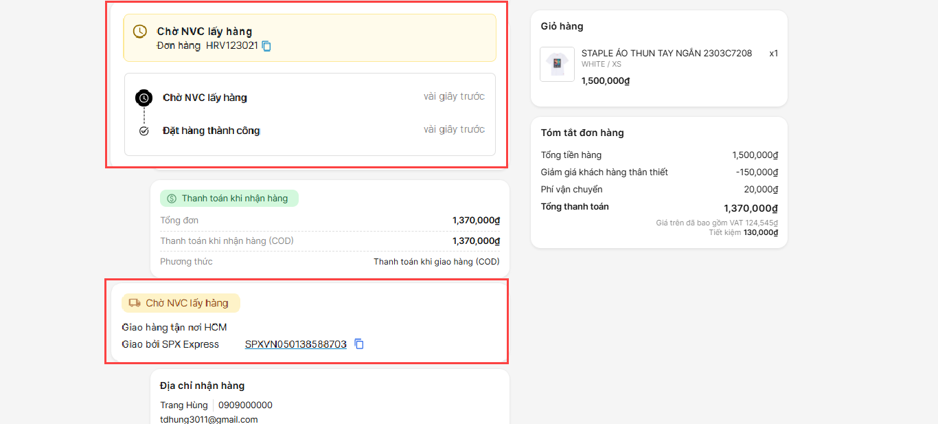 Khách hàng có thể theo dõi trạng thái đơn hàng một cách nhanh chóng với đầy đủ thông tin về nhà vận chuyển, mã vận đơn và lộ trình giao hàng. Hệ thống tự động đồng bộ dữ liệu từ đơn vị vận chuyển, giúp người mua cập nhật tình trạng đơn hàng theo thời gian thực. Nhờ đó, khách hàng có thể chủ động sắp xếp thời gian nhận hàng và yên tâm trong suốt quá trình giao nhận.
