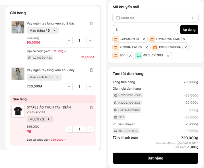 - Trường hợp đơn hàng đáp ứng điều kiện khuyến mãi của cả chương trình khuyến mãi và các loại mã khuyến mãi, hệ thống sẽ áp dụng giảm giá theo thứ tự sau: CTKM - Mã giảm giá sản phẩm/Đồng giá - Mã khuyến mãi đơn hàng. Mã khuyến mãi vận chuyển sẽ áp dụng riêng trên phí vận chuyển, không ảnh hưởng đến giảm giá tổng tiền hàng.