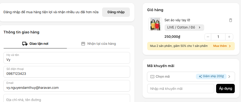 Trang thanh toán thông minh của Haravan giúp khách hàng nhập địa chỉ dễ dàng hơn với tính năng tự động đề xuất. Khi khách hàng bắt đầu nhập thông tin giao hàng, hệ thống sẽ gợi ý địa chỉ phù hợp, khách có thể chọn và hệ thống tự động điền đầy đủ các trường như số nhà, đường, phường/xã, quận/huyện và tỉnh/thành phố. Nhờ đó, quá trình nhập liệu trở nên nhanh chóng, chính xác, hạn chế sai sót và rút gọn thời gian hoàn tất đơn hàng.