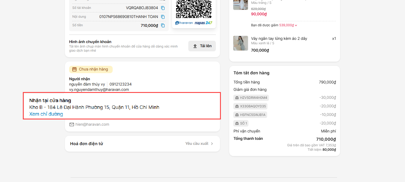 Trang thanh toán thông minh của Haravan cho phép khách hàng chọn chi nhánh nhận hàng khi mua sắm tại cửa hàng. Người mua có thể xem danh sách chi nhánh khả dụng, địa chỉ chi tiết và chọn cửa hàng phù hợp nhất. Mỗi chi nhánh đều đi kèm đường dẫn Google Maps, giúp khách hàng dễ dàng tìm đường và đến lấy hàng nhanh chóng.