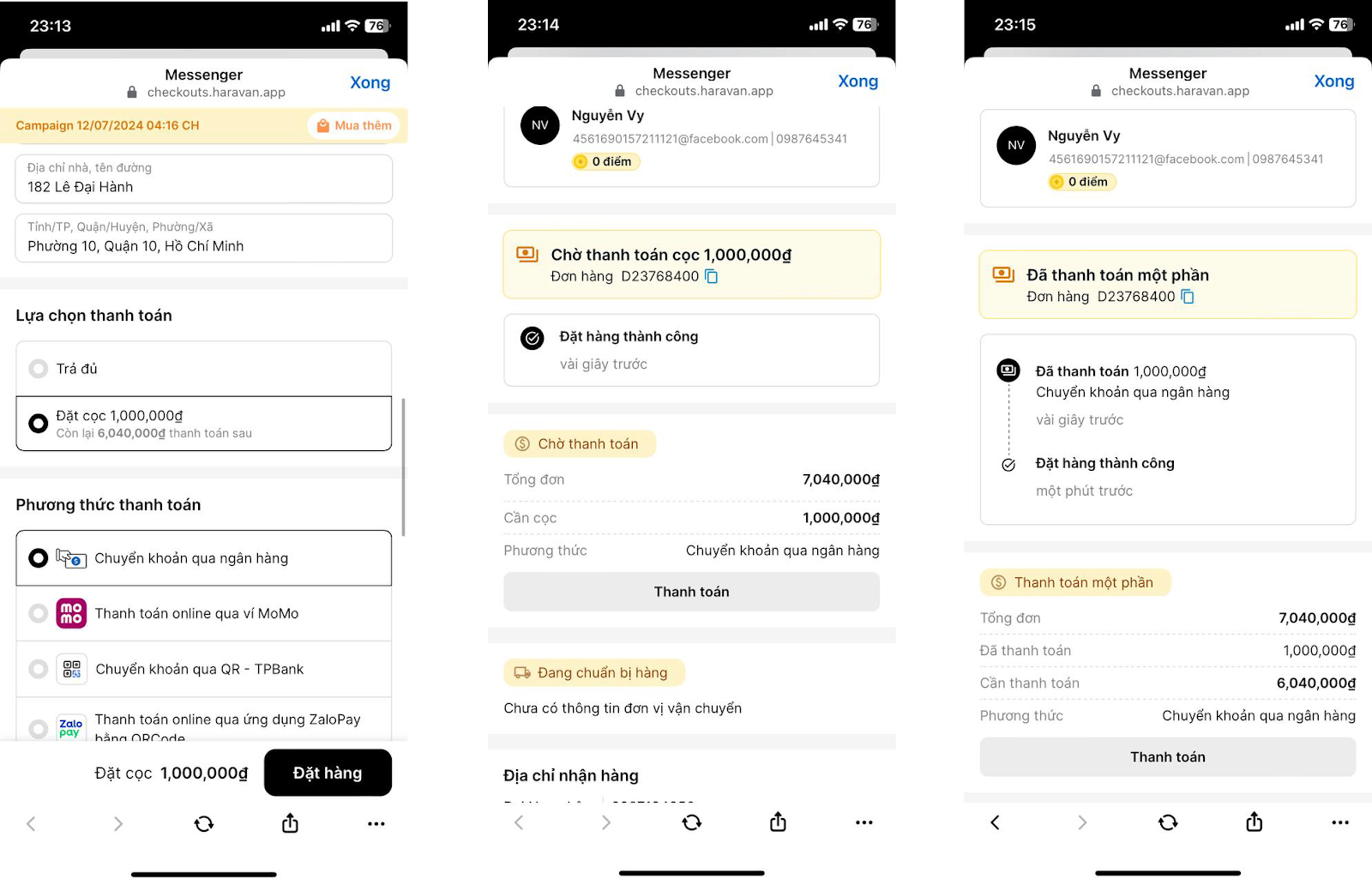 Trang thanh toán thông minh của Haravan hỗ trợ tính năng thanh toán đặt cọc, hỗ trợ nhà bán thiết lập yêu cầu thanh toán trước cho các đơn hàng có giá trị lớn. Người mua sẽ cần thanh toán trước một phần đơn hàng để cam kết mua hàng trước khi đơn được xử lý và giao đi. Điều này không chỉ giúp giảm rủi ro hủy đơn, tối ưu dòng tiền cho nhà bán mà còn mang đến trải nghiệm thanh toán minh bạch, thuận tiện cho khách hàng.