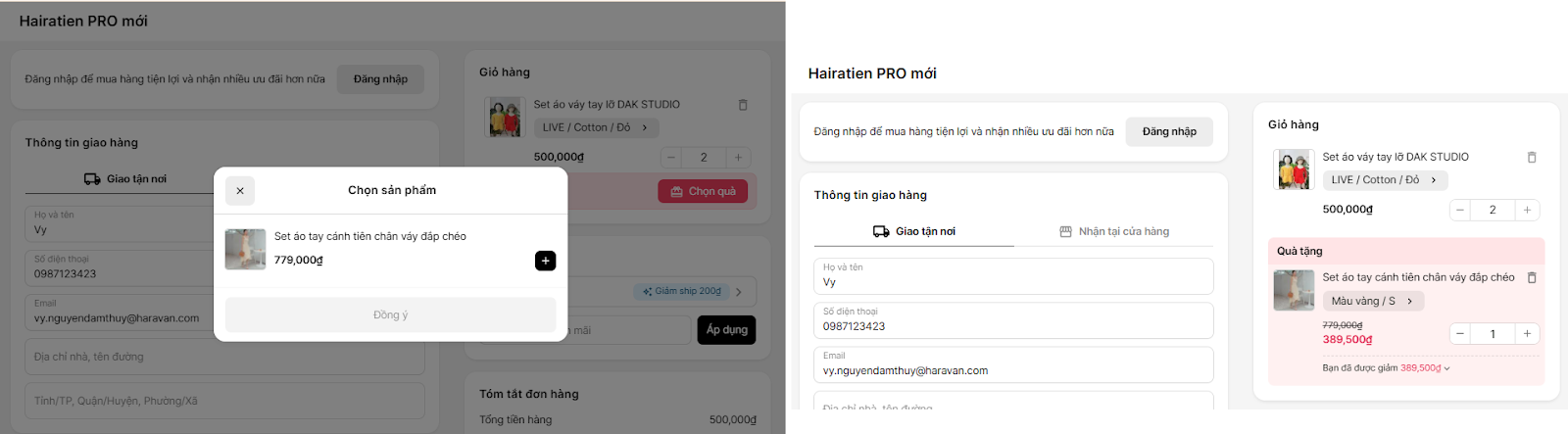 Với trang thanh toán trước đây, khi có nhu cầu thay đổi sản phẩm hoặc điều chỉnh số lượng, người mua phải trở lại trang giỏ hàng để chỉnh sửa. Thao tác phức tạp dễ khiến người mua bỏ giỏ hàng và không hoàn tất thanh toán. Do đó, Haravan đã nâng cấp phần thông tin sản phẩm hiển thị cho phép người mua chọn lại biến thể và điều chỉnh số lượng mới ngay trên trang thanh toán. Tối ưu thao tác tùy chỉnh sản phẩm mua sẽ làm giảm tỉ lệ rời bỏ đơn hàng và tăng tỉ lệ hoàn tất đơn.