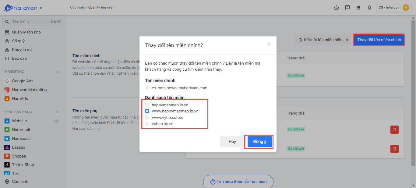 Bạn truy cập vào Cấu hình => Tên miền => Chọn Thay đổi tên miền Chính và chọn tên miền tương ứng.