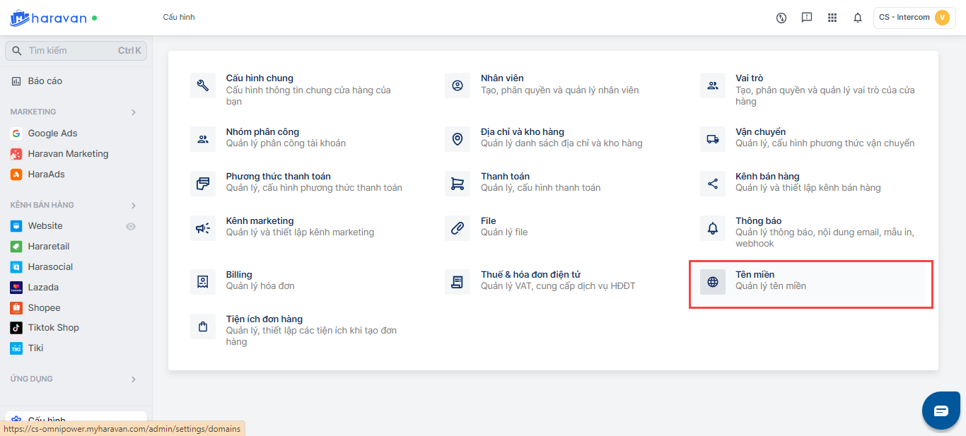Bước 1 Thêm tên miền riêng của bạn tại mục Cấu hình Tên miền trên trang quản trị để lấy địa chỉ IP Haravan