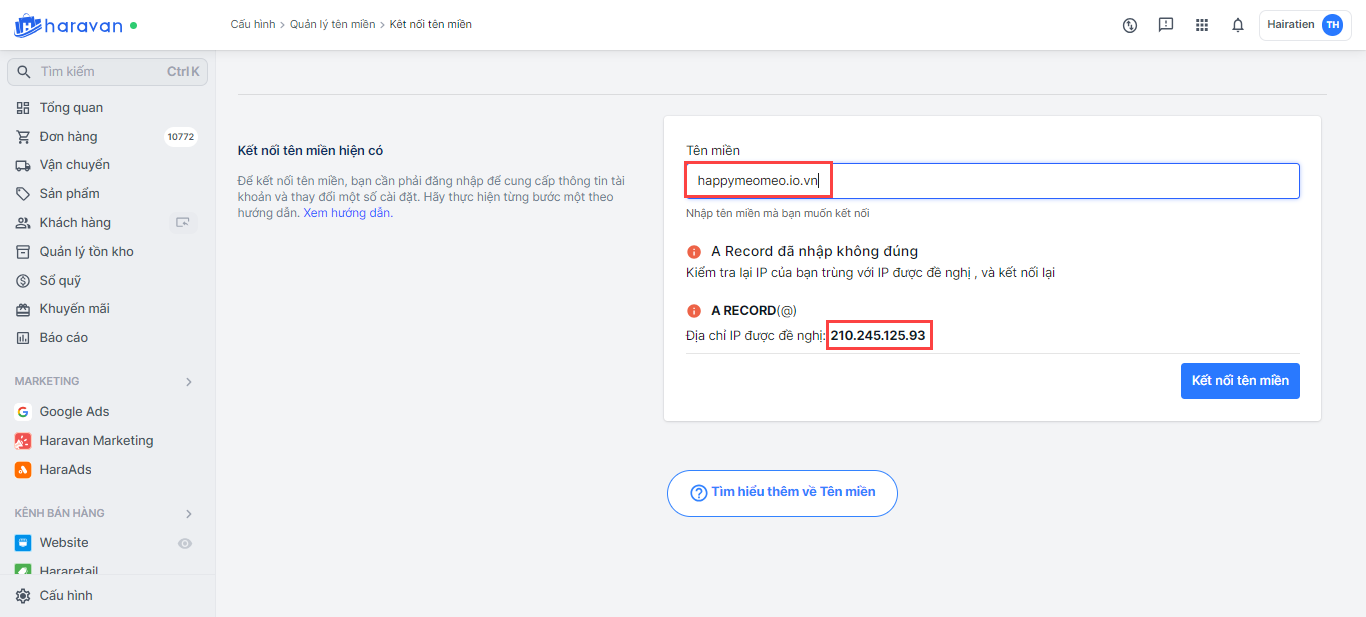 - Thao tác kết nối tên miền đã mua về website Haravan