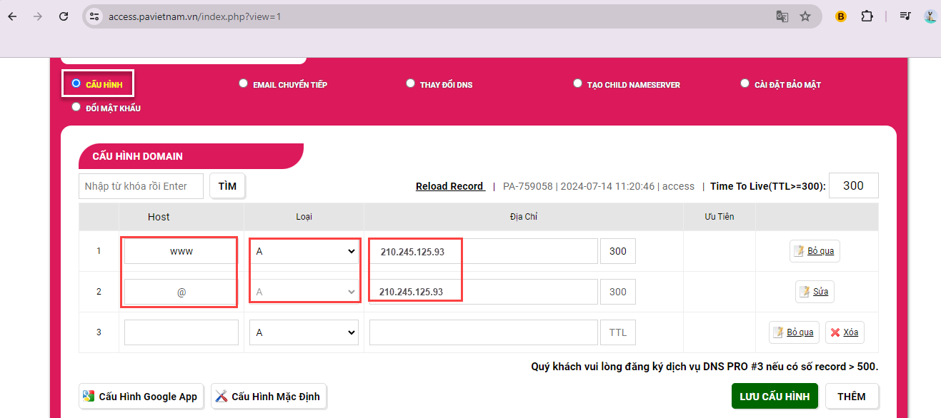 Bước 2 Đăng nhập vào tài khoản tên miền PA và thực hiệnthêm địa chỉ IP của Haravan vào record www và record @