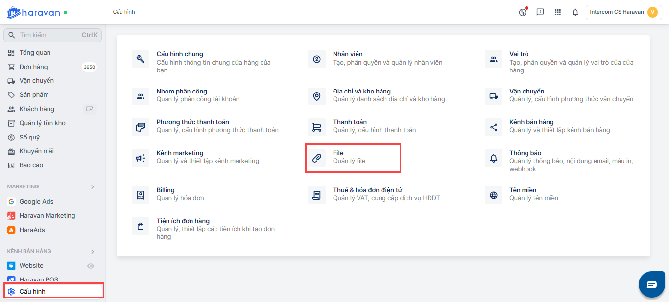 - Truy cập vào admin Haravan, mục Cấu hình và chọn File