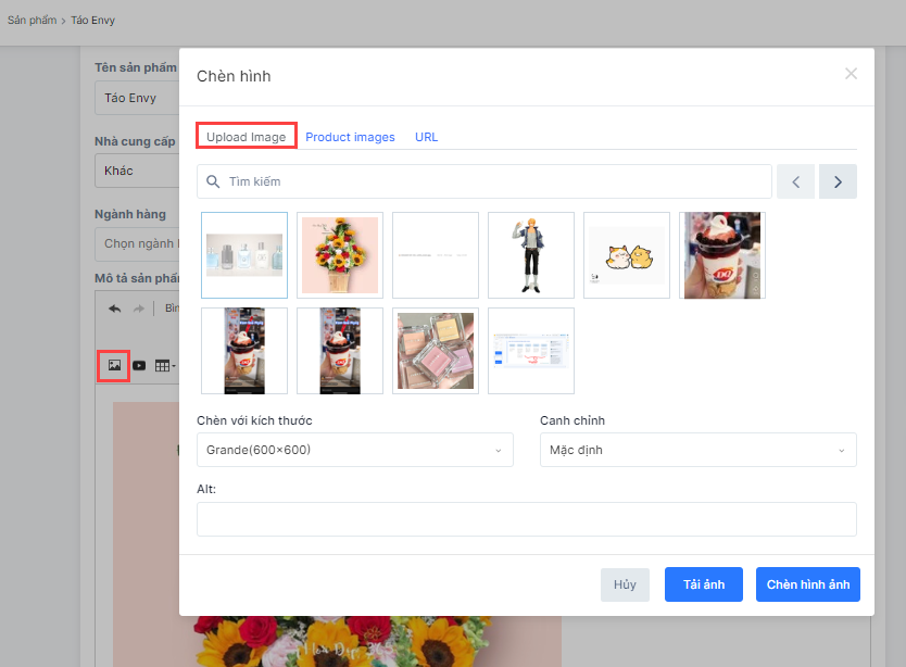 - Chèn hình ảnh: Ảnh được tự động lưu vào mục Upload Image khi chèn hình ảnh vào mô tả sản phẩm.