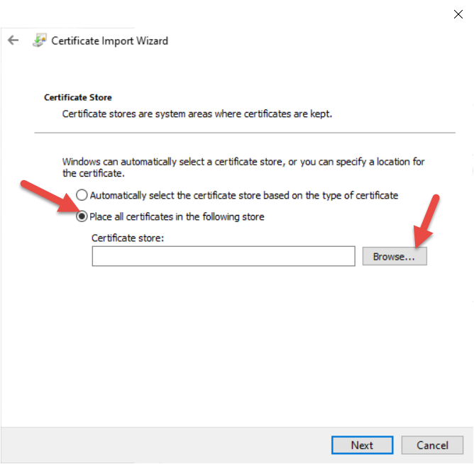Bước 4: Bạn chọn Place all certificates in the Following store và sau đó chọn Browse