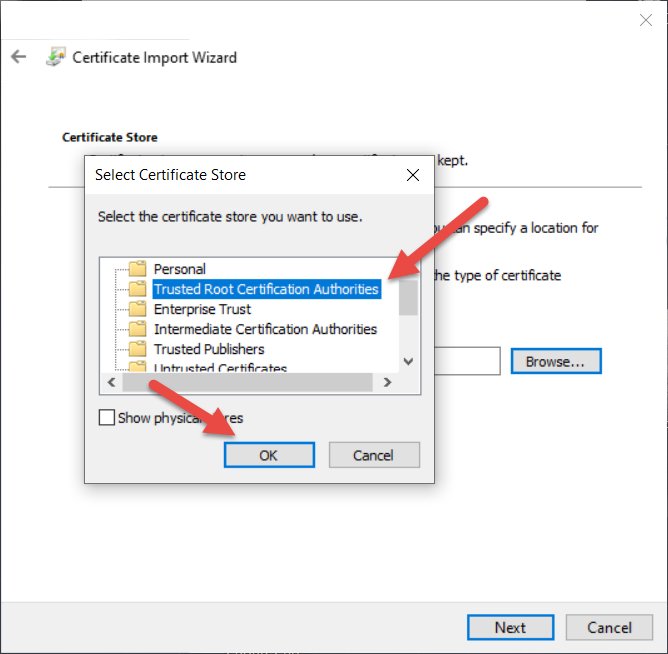 Bước 5: Trong cửa sổ Select Certificate Store, bạn chọn Trusted Root Certification Authorities và chọn OK. Nhấn Next để tiếp tục