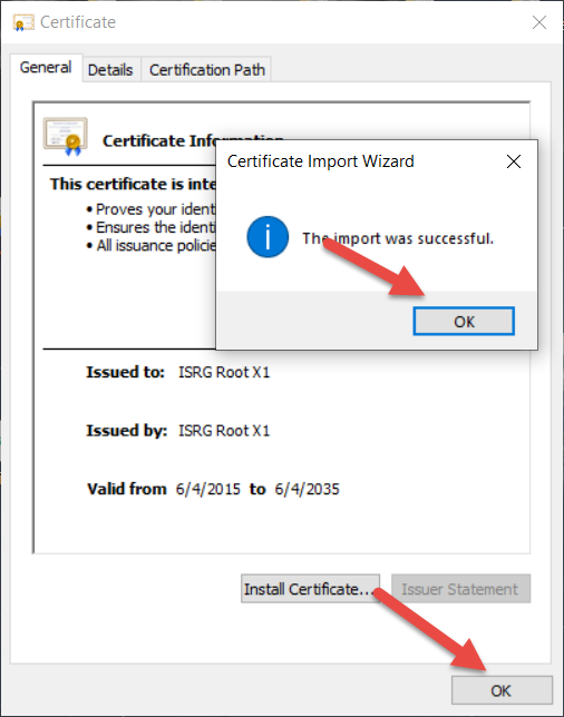 Bước 7: Lúc này sẽ có thông báo bạn đã thiết lập thành công, chọn OK để đóng thông báo và đóng cửa sổ Certificate