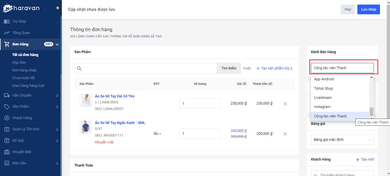 Bước 4: Chọn kênh bán hàng khi tạo đơn mới trên admin.