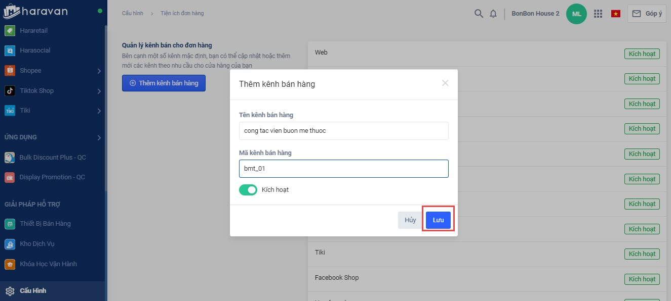 Bước 3: Nhập tên kênh bán hàng, mã kênh bán, kênh bán hàng mới tạo sẽ được mặc định Kích hoạt.