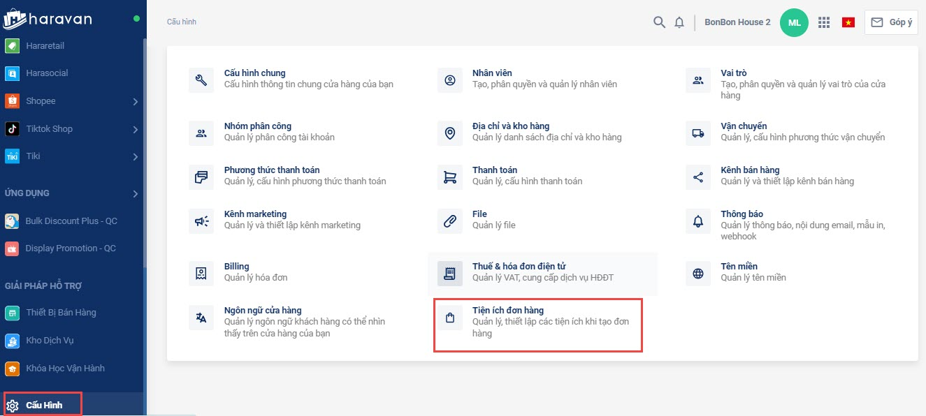 Bước 1: Tại mục Cấu hình, bạn chọn Tiện ích đơn hàng.