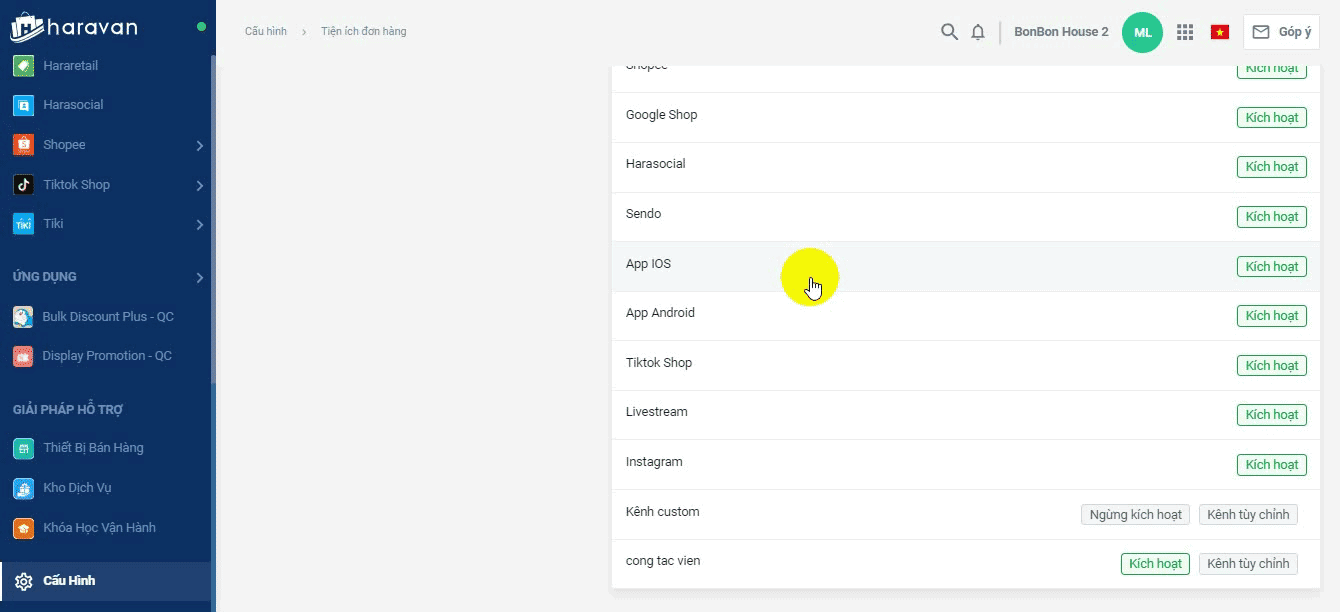 Ngoài các kênh bán hàng mặc định của Haravan, nhà bán có thể tự tạo những kênh bán hàng khác phù hợp với việc vận hành của doanh nghiệp. Tính năng sẽ hữu ích với các nhà bán có đơn hàng phát sinh từ nhiều nguồn khác nhau.