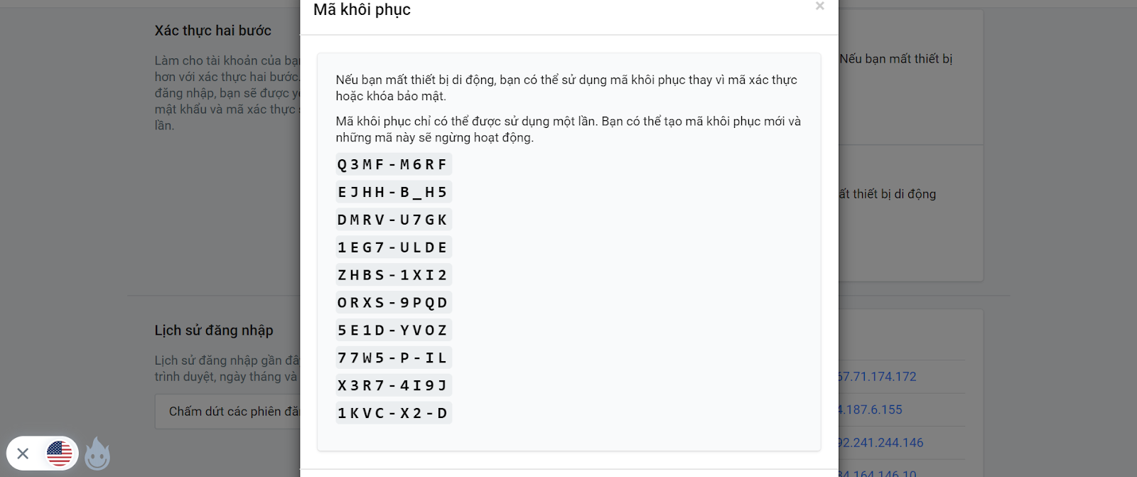 Ở đây sẽ có tất cả 10 mã và mỗi mã chỉ sử dụng 1 lần, và đặc biệt quan trọng bạn nên lưu lại 10 mã này vào 1 nơi an toàn để có thể sử dụng trong những trường hợp trên: