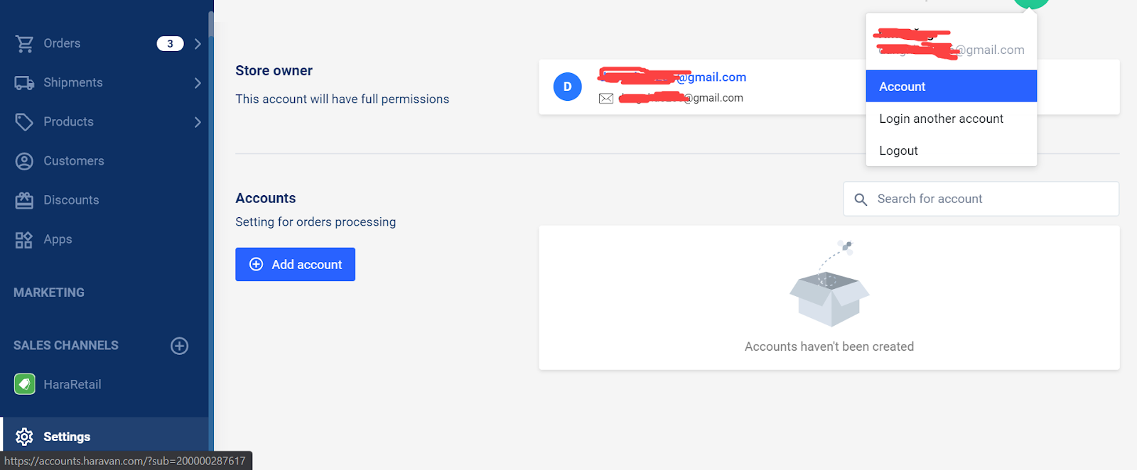 Bước 2: Đăng nhập tài khoản vào trang quản trị MyHaravan, khi đã nhập đúng tài khoản, trình duyệt sẽ chuyển sang trang account, lúc này chọn tab Bảo mậtvà click Kích hoạt xác thực: