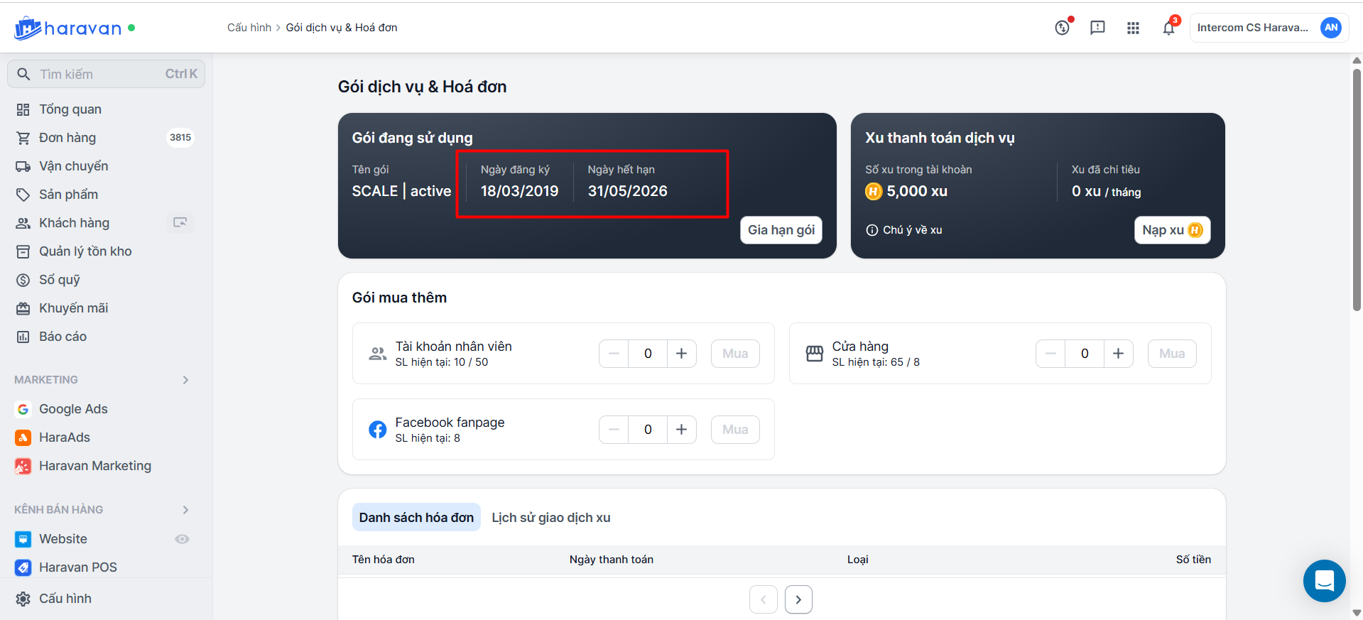 Thời gian kích hoạt sẽ được tính tại thời điểm bạn thanh toán gói dịch vụ . Để kiểm tra thời gian sử dụng website . Bạn dùng email chủ cửa hàng, đăng nhập vào admin Haravan -> chọn cấu hình > chọn Billing ( quản lý hóa đơn ) . Ngày đăng kí sẽ là ngày kích hoạt web .