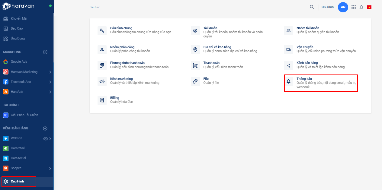 - Từ Trang quản trị -> Cấu hình -> Thông báo.