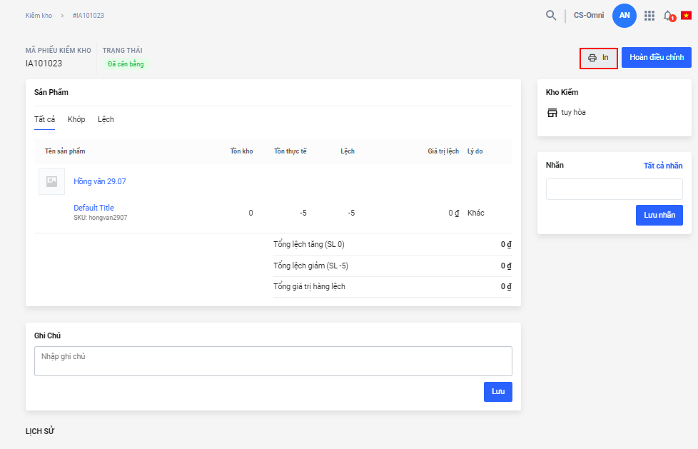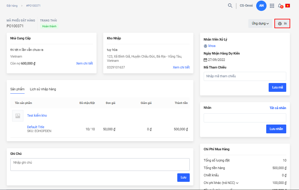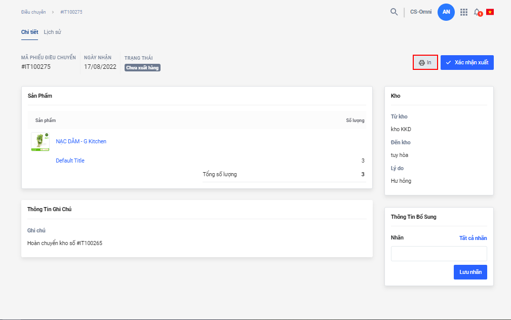 - Trong chi tiết của phiếu Điều chuyển/Điều chỉnh/Mua hàng, Nhà bán hàng chọn In.