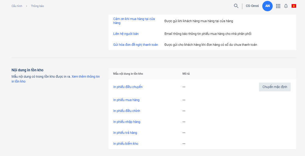 2. Trong Cấu hình thông báo, Nhà bán hàng kéo xuống mục Nội dung in tồn kho.