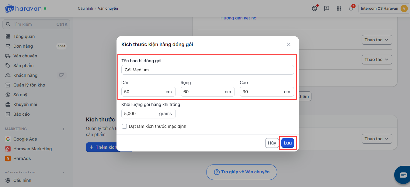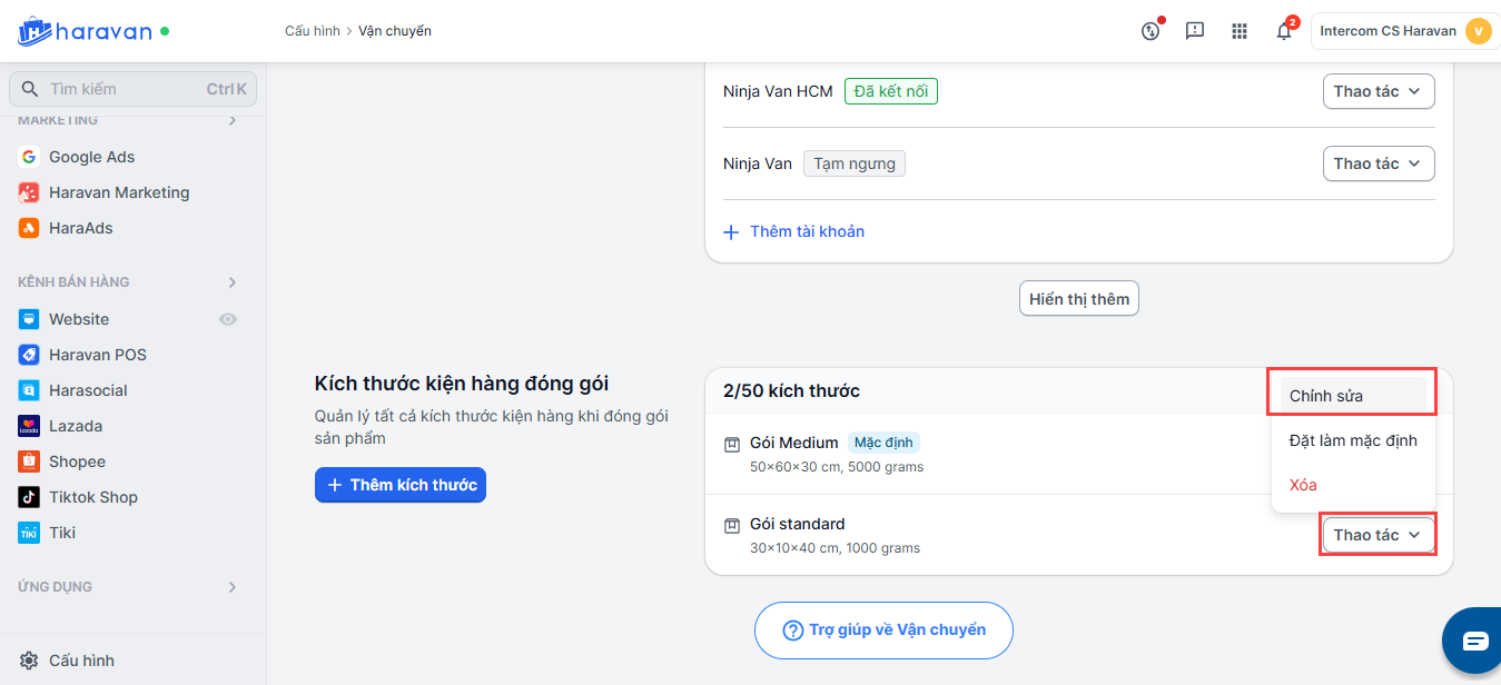 Tính năng quản lý thước kiện hàng đóng gói hỗ trợ nhà bán hàng thiết lập sẵn các kích thước đóng gói cho các loại đơn hàng khác nhau. Khi đóng gói, nhân viên chỉ cần chọn kích thước phù hợp từ danh sách đã cài đặt, và thông tin này sẽ tự động cập nhật vào vận đơn.