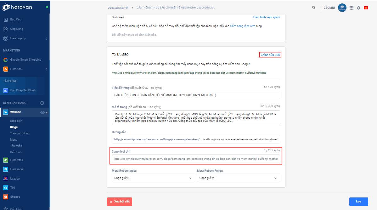 - Thiết lập Canonical cho bài viết trên website