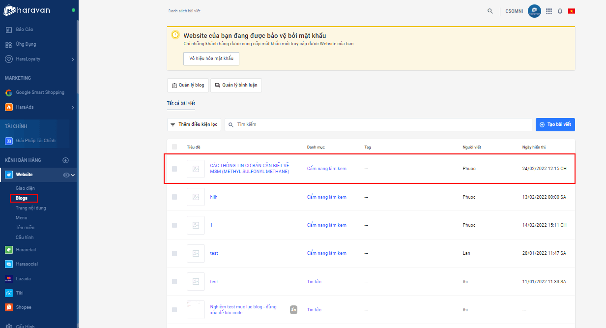 Để thiết lập Canonical cho bài viết trên trang, bạn chọn website -> blogs -> Chọn bài viết bạn muốn thiết lập Canonical