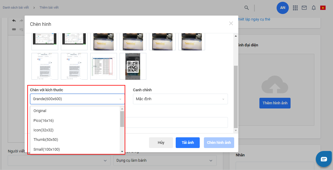 2. Nhà bán hàng lựa chọn kích thước hình ảnh. Kích thước mặc định của hệ thống là Grande (600x600).