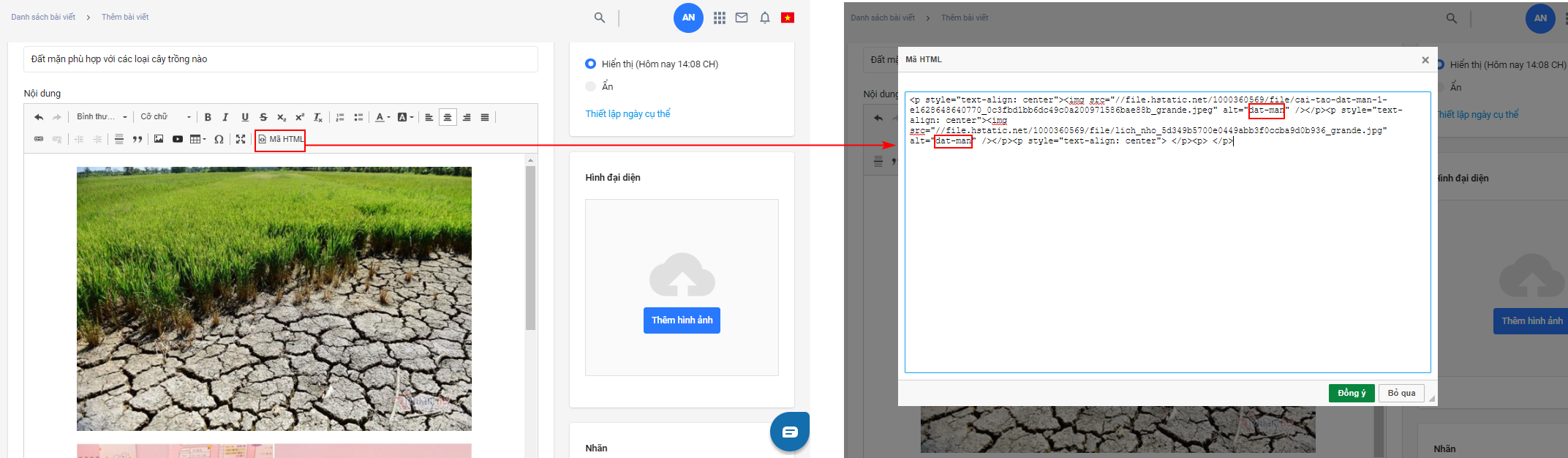 - Khi nhà bán hàng chèn nhiều ảnh cùng một lúc, nội dung nhập trong mục ALT sẽ được áp dụng cho các hình đã chèn. Để chỉnh lại alt cho từng ảnh, nhà bán hàng chọn Mã HTML và thực hiện chỉnh lại thẻ alt cho từng ảnh